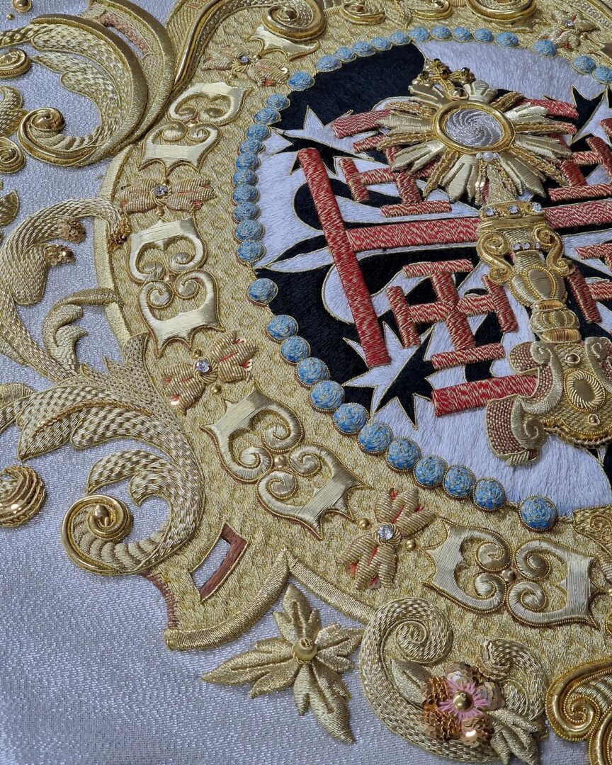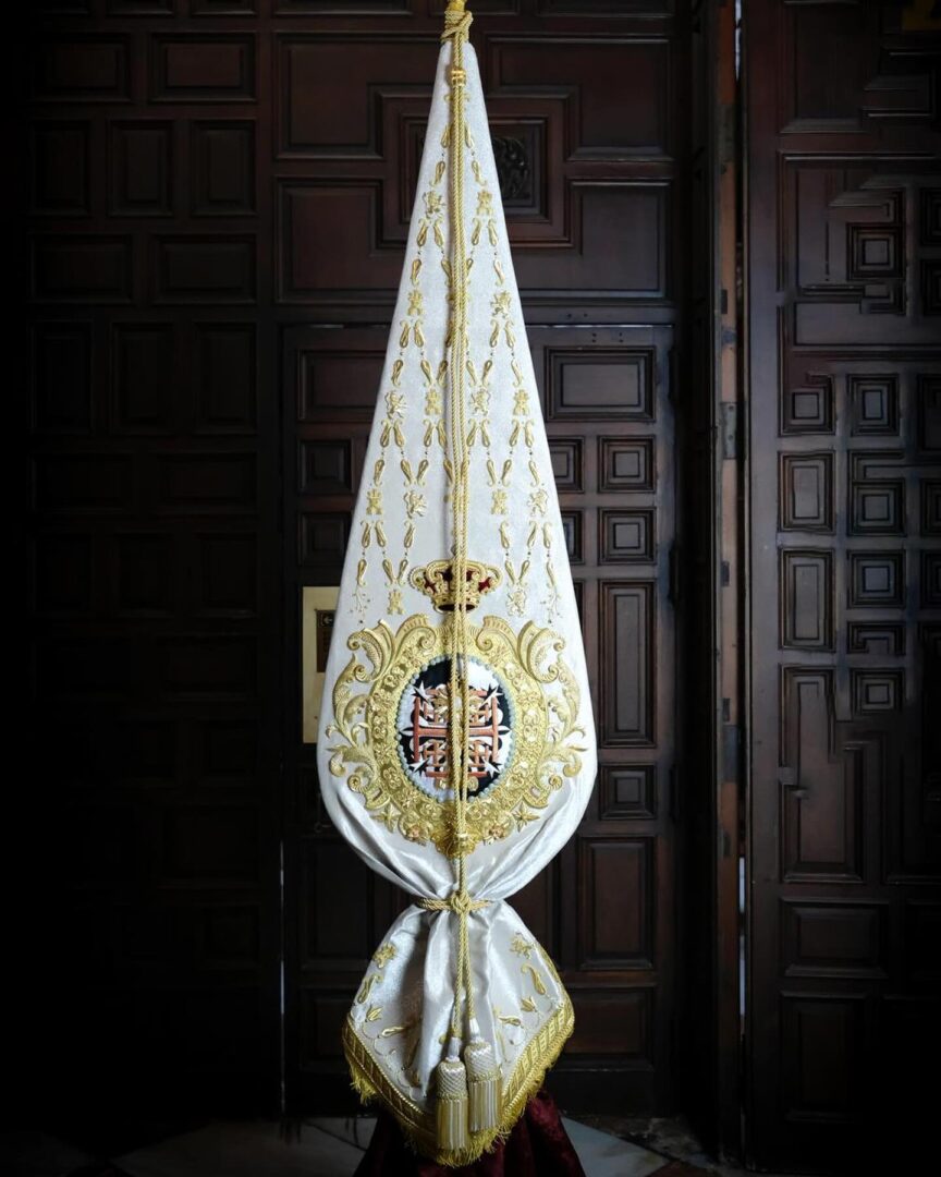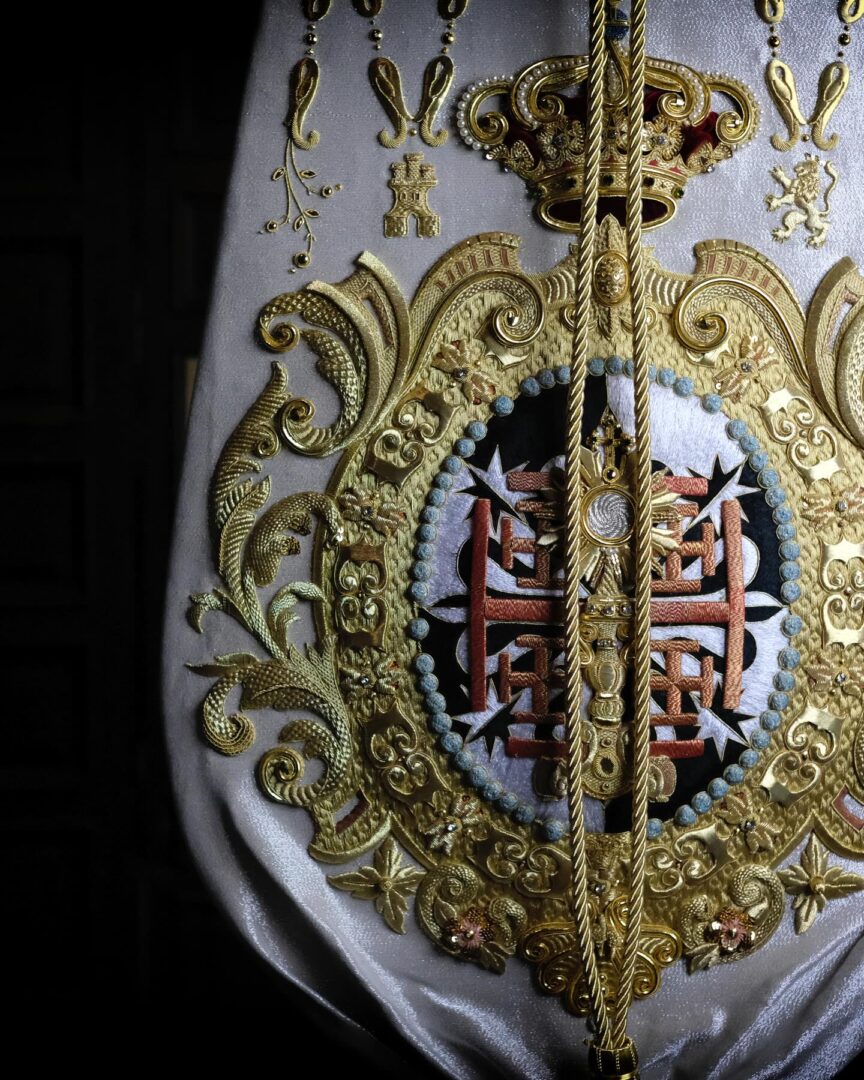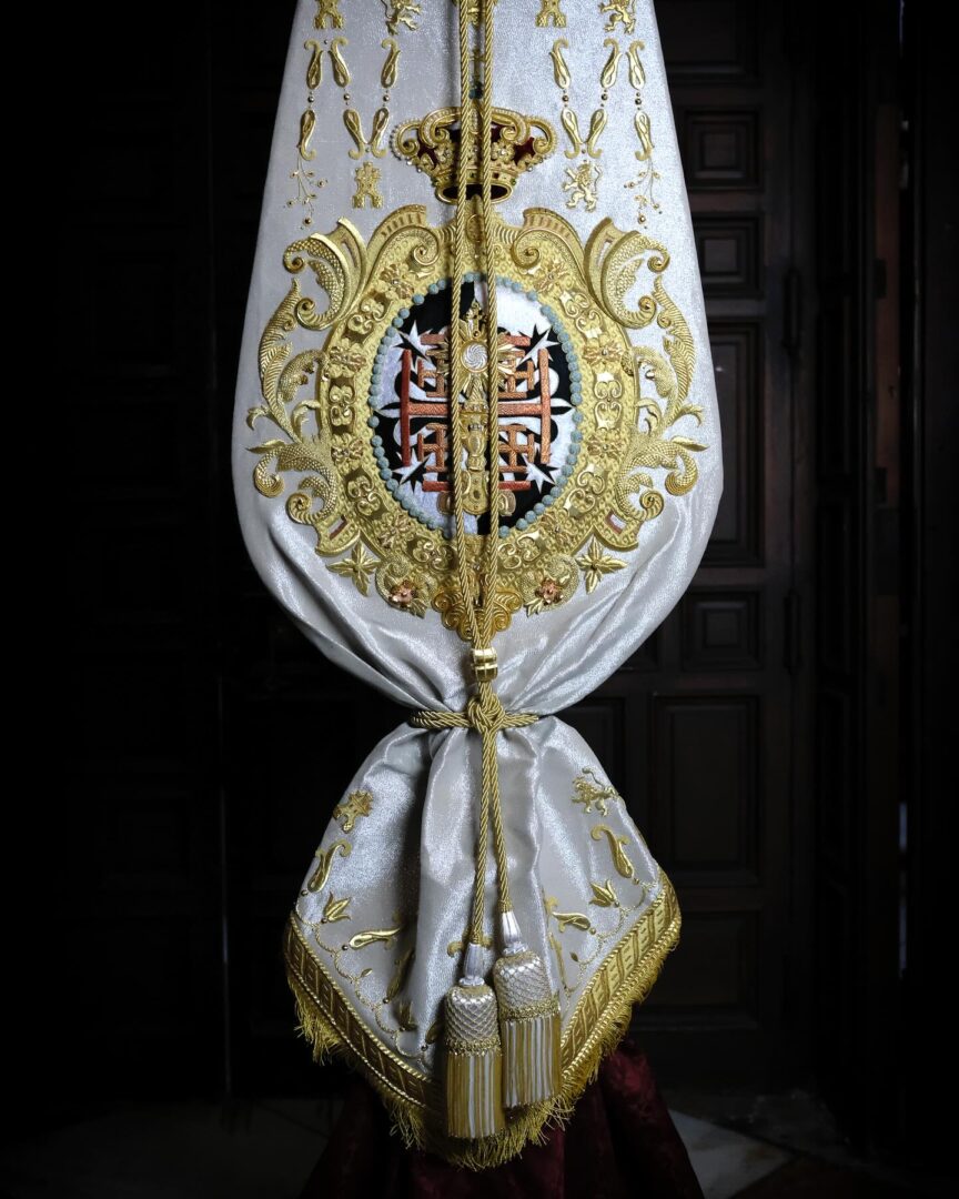 El granadino José Manuel Martínez Hurtado ha sido el encargado de bordar con gran maestría esta pieza sobre un tejido de tisú de plata, donde destaca, en una concentración de diferentes puntos y formas, la cartela central con el escudo de la Hermandad realizada en sedas de colores.